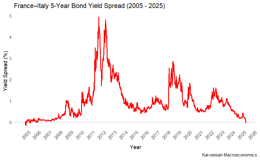 For a very long time, the yield on Italian bonds (known as BTPs - Buoni del Tesoro Poliennali) has always been higher than French bonds (OATs - Obligation Assimilable du Trésor). The exception to this are short-term yields. Toby Nangle, a columnist for the Financial Times, noted that two-year BTPs infrequently traded through two-year OATs back in May this year, and briefly at the start of 2024. But such short-term yields are highly sensitive to monetary policy (or even expectations of monetary policy). Sudden surges in demand can also push 2-year yields down, even if underlying fundamentals haven’t changed much.